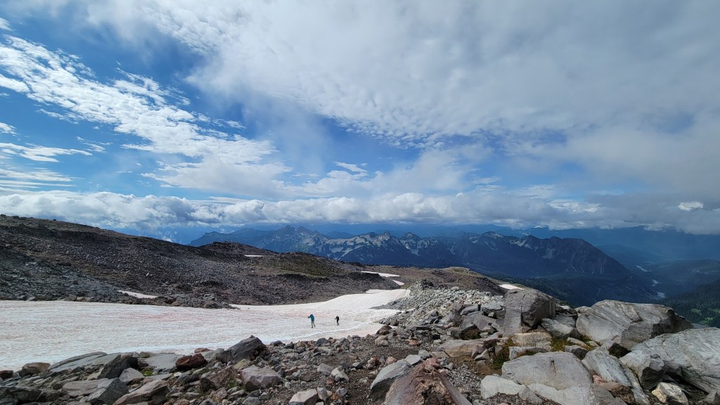 Shortly after, you’ll begin encountering snowfields. At first, these may be intermittent — snow broken up by rocks and dirt. As you continue upward, the snowfields become persistent and unavoidable.