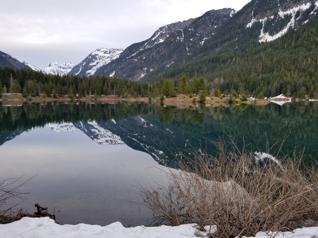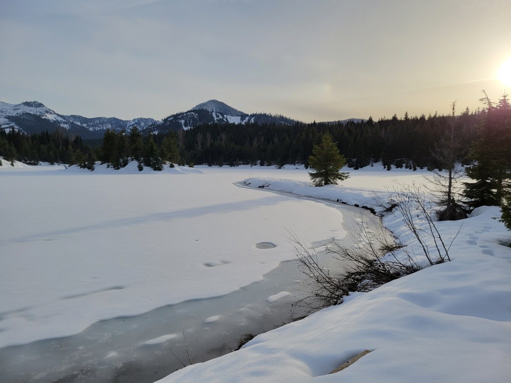 Even as spring approaches, Gold Creek Pond often stays snow-covered into late March or April, making it one of the longer-lasting winter destinations near Snoqualmie Pass.